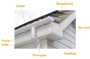 Fascias are the vertical boards that attach to the lower edge of the roof, while soffits are the horizontal boards underneath the fascias. Guttering is the system of channels that collect and divert rainwater away from the roof.